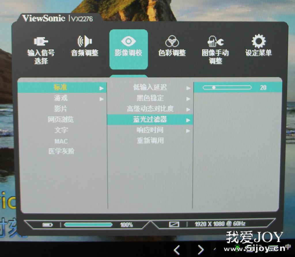 初始优派VX2276预设的标准模式与AOC显示器画面色彩有较大差异,后来调成网页浏览模式后2者基本无色差了。这里赞一下这样的预设好的模式,方便普通用户挑选喜好的色调,稍后我对显示器的菜单内容做些介绍。