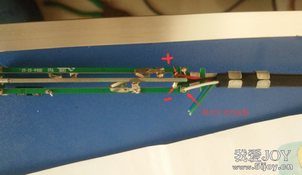 1、首先焊接好震动开关。震动开关银色脚在下,金色脚在上,把银脚线路与T12发热芯的负极相连,焊接好。