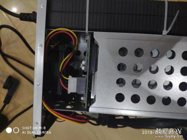 主板上送的SATA电源线只有一个接口,接多个硬盘的话必须再转多出来,所以要买1分2线。蜗牛星际硬盘背板上用的大4PIN电源接口,所以还要配个sata转ide线。一个接我mSATA硬盘,另一个转换出的大4PIN插背板。目前硬盘仓只放了一快500G硬盘,其他都是空的。