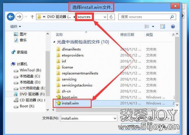 5、弹出的文件文件打开位置,双击刚才挂载好的光驱驱动器,进入sources目录,选中install.wim文件,点打开。